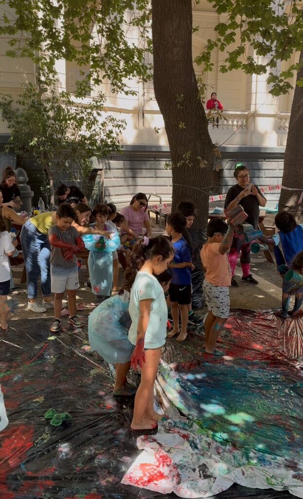 En su actividad de cierre, las y los pequeños realizaron una pintura abstracta, explorando los diversos colores y el movimiento a través del uso de vasos con pintura y sus propias manos. Esta instancia les dio libertad creativa para explorar y expresarse, cerrando el curso de manera dinámica y en comunidad.